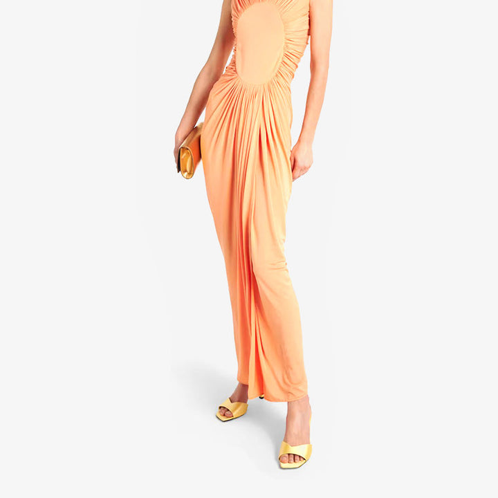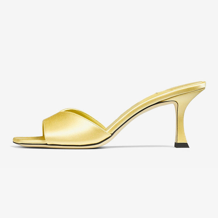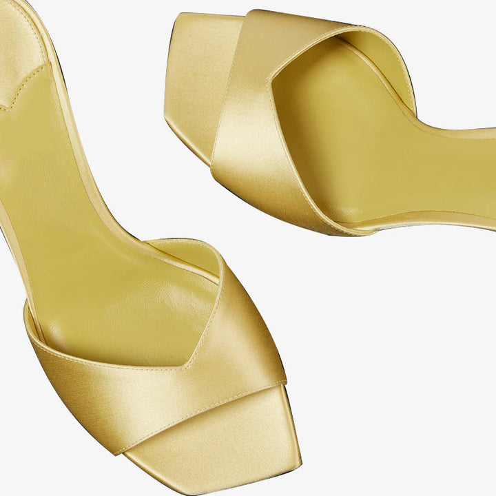 Crafted from lustrous yellow satin, these slip-on mules feature a low-cut vamp, square open toe, and sculpted mid-height heel for a sleek, modern look. Color:yellow