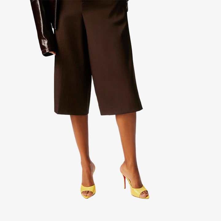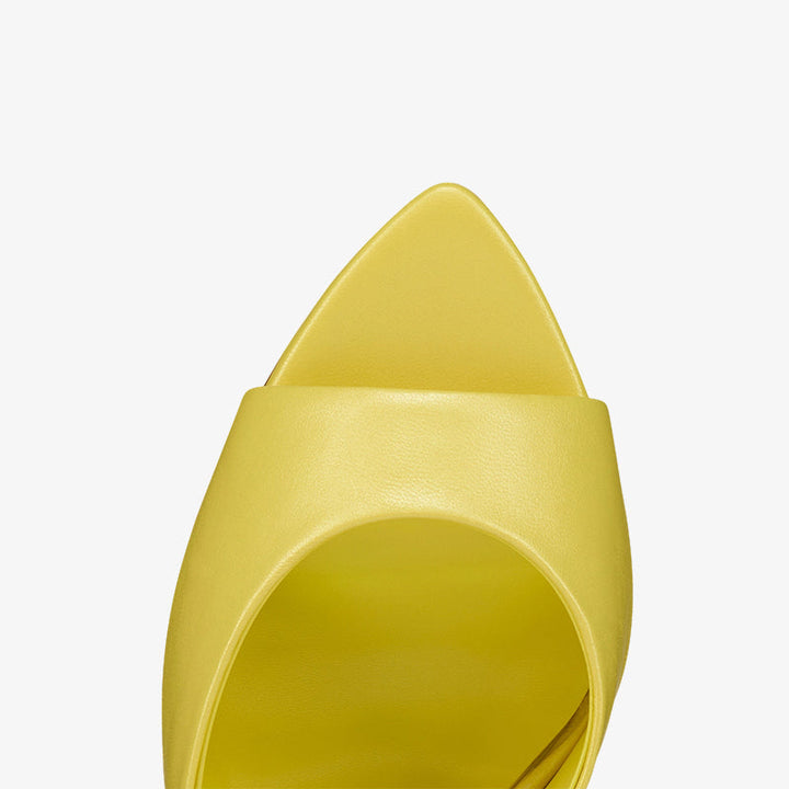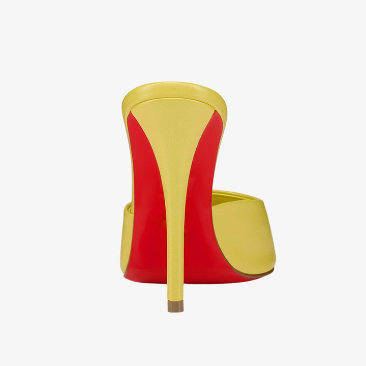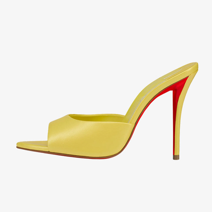 This mule features a sleek tapered silhouette set on a stiletto heel with a red sole. Made from iridescent yellow calf leather, it includes a padded insole and a slim band that elegantly reveals the toe.